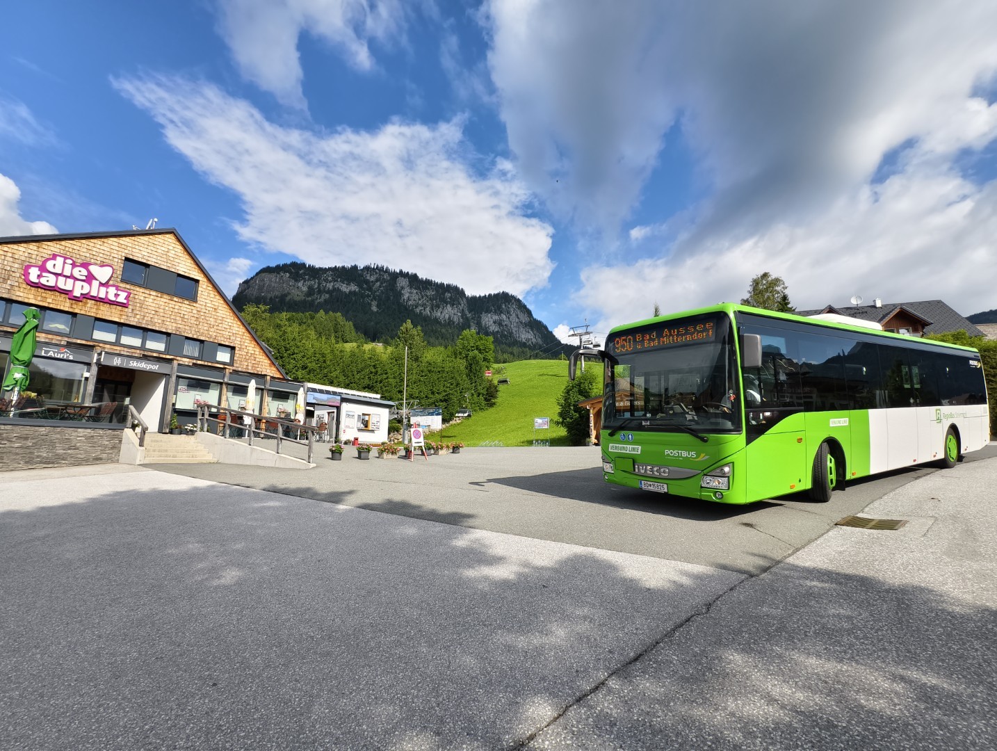 Postbus BD 15825 ein IVECO Crossway LE, 12 Meter steht hier bei der Haltestelle Tauplitz Talstation Berglift, unterwegs als Linie 950 nach Bad Aussee.