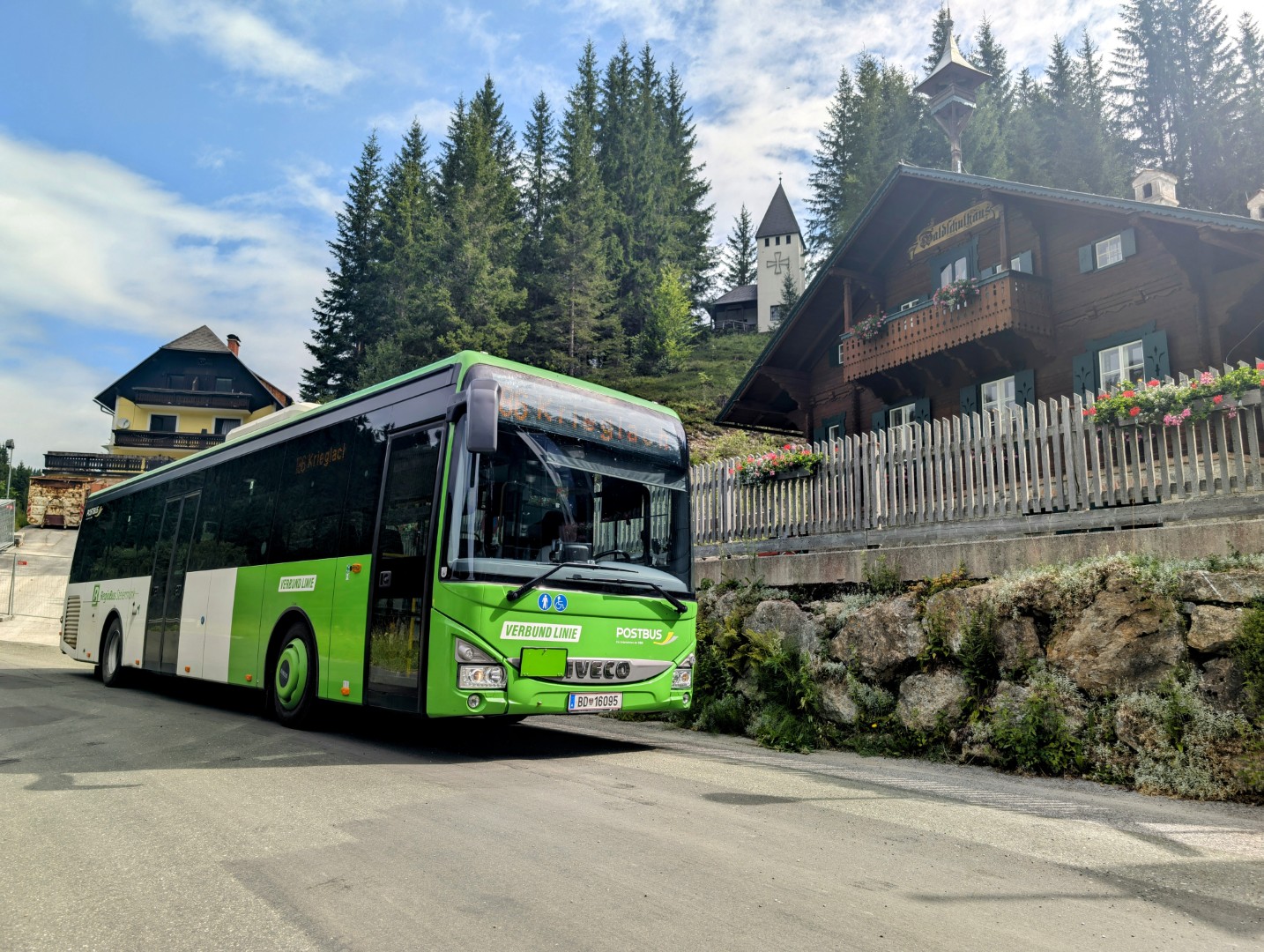 BD 16092 - ein IVECO Crossway LE, 12 Meter, der Verkehrsstelle Kindberg fährt hier gerade in Kapellen Kirche Richtung Mürzzuschlag, auf der Linie 189. Stationiert ist dieser Bus in Mürzzuschlag.